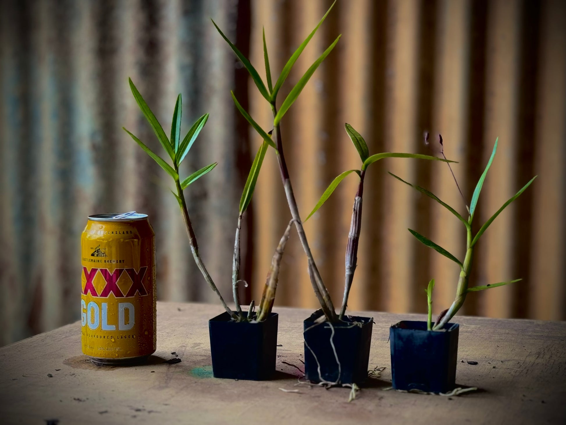 Straight species genetics, with nothing added into the mix. Our Cooktown Orchids are the real deal, being bred from seed from our wild mother plant. These plants have about 4 years of growth and are ready to be potted up or transferred to your preferred timber.