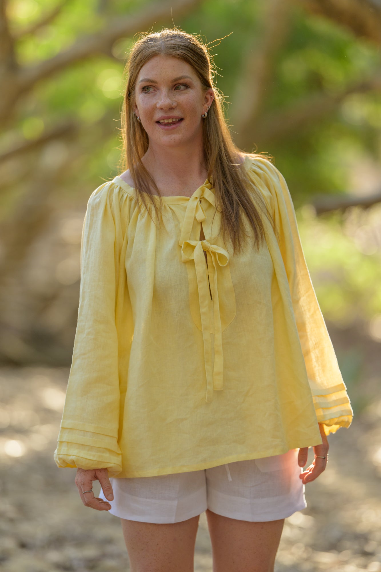 With a flattering V-neckline featuring ties and button closure, airy balloon sleeves with pin-tuck detailing, and elastic cuffs (wear them long or shove ’em up to 3/4 length), this top is all about effortless wear. Wide openings mean you can slip it on... or off! easy, no dramas.